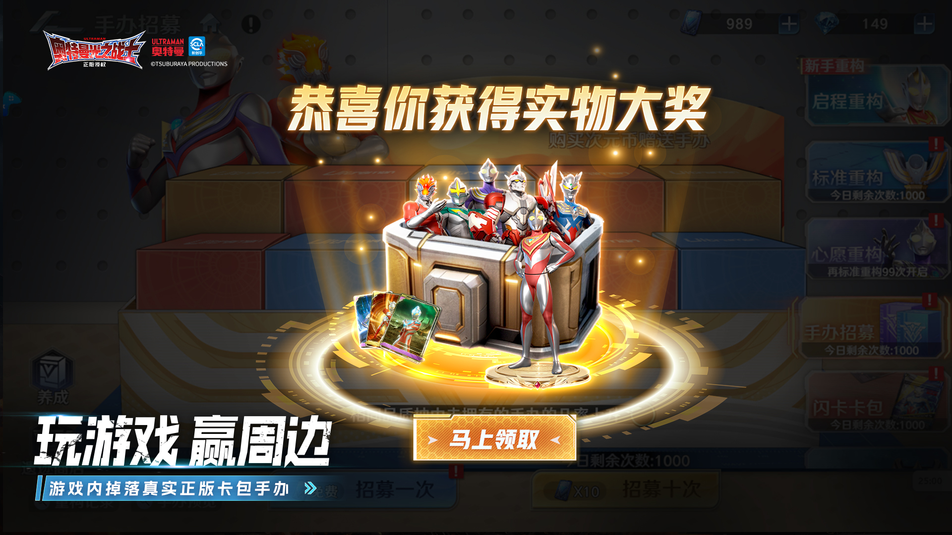 策划:没错!在《奥特曼:光之战士》中,公测后前往“重构”玩法即有机会获取包含正版卡包/正版手办在内的实物周边奖励!每天的两个时段内将会有大量的实物周边奖励名额掉落,具体内容介绍将在公测前放出,请持续关注后续官方公告。以游戏内上线版本为准哦。