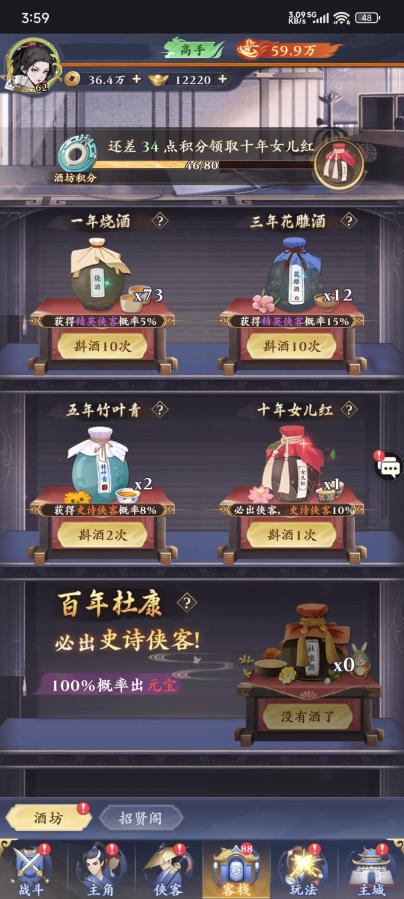 十年女儿红:精英侠客概率90%、史诗侠客概率10%,可获得侠客突破丹,斟酒获得50酒坊积分。