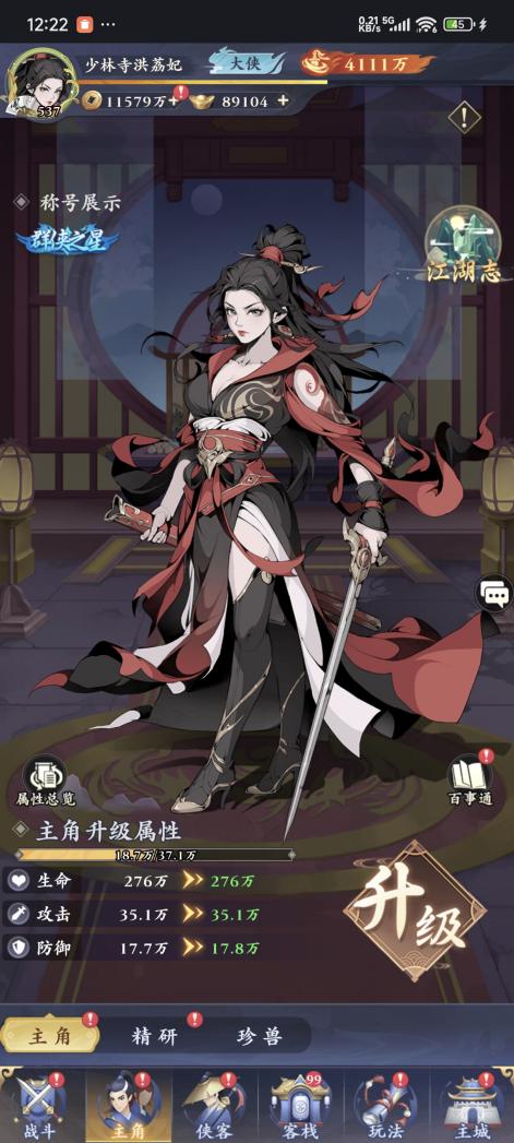 4、左下角可进入【精研】功能,可提升侠客的各类属性加成。珍兽则是战斗中辅助战斗的辅助单位。