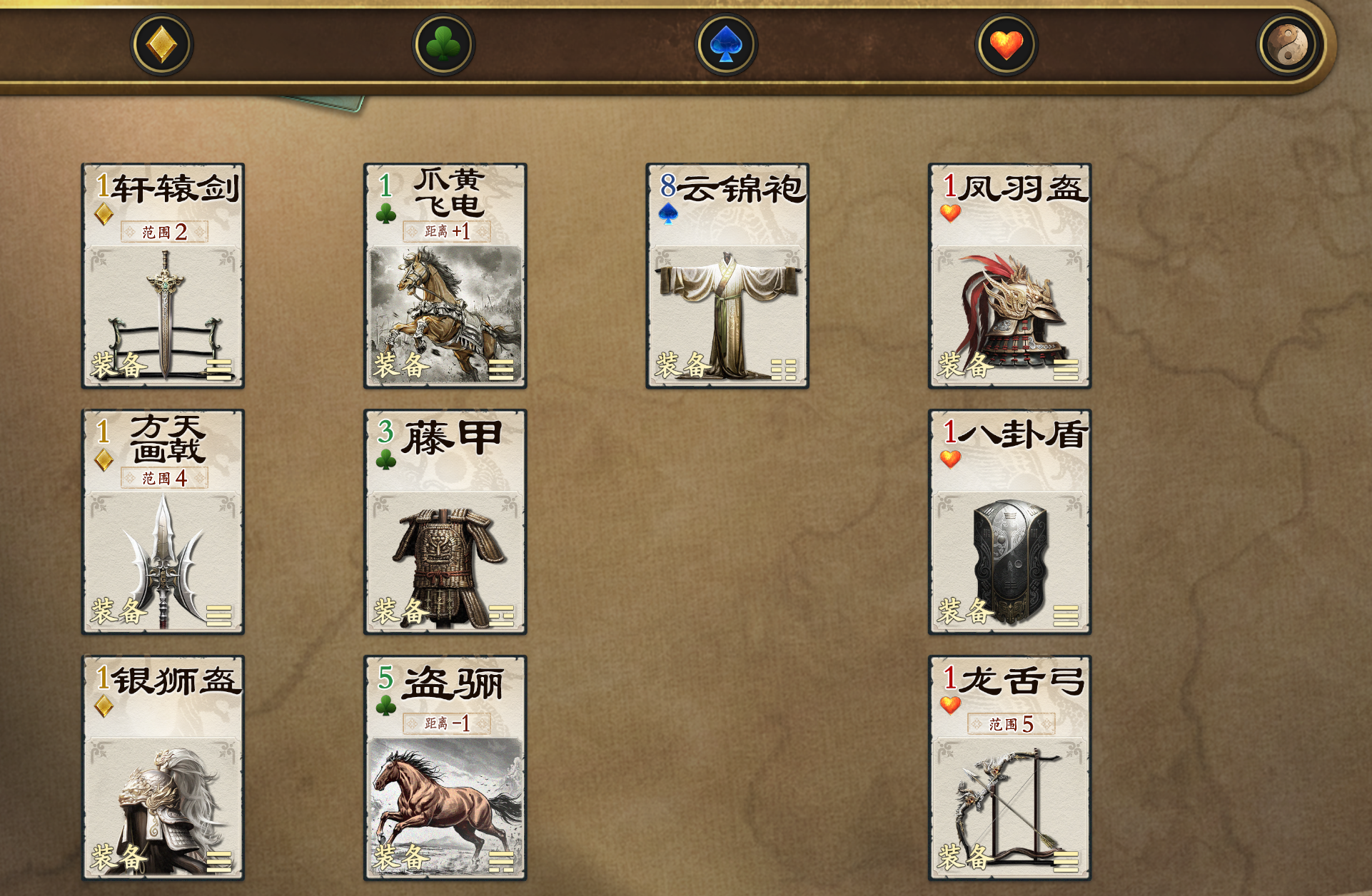 初始装备栏为3个,可装备武器、防具、马匹等手牌,满栏位后要进行替换。不同的装备会提供不同效果,装备牌也没限制使用次数。刚玩游戏的萌新会觉得手牌数量多,但只要一局一局的慢慢玩,马上就能熟悉全部手牌。