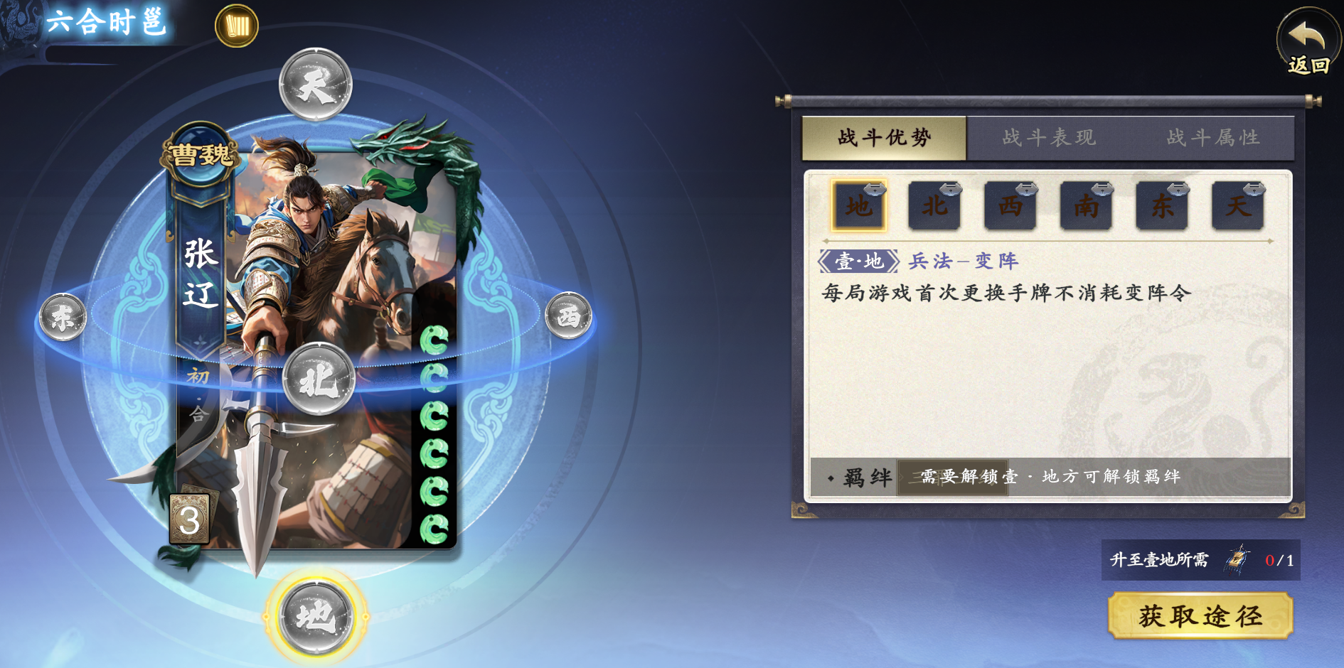 2阶(对应地):每局游戏首次更换手牌不消耗变阵令,可优化牌序,要选这名武将才可生效;