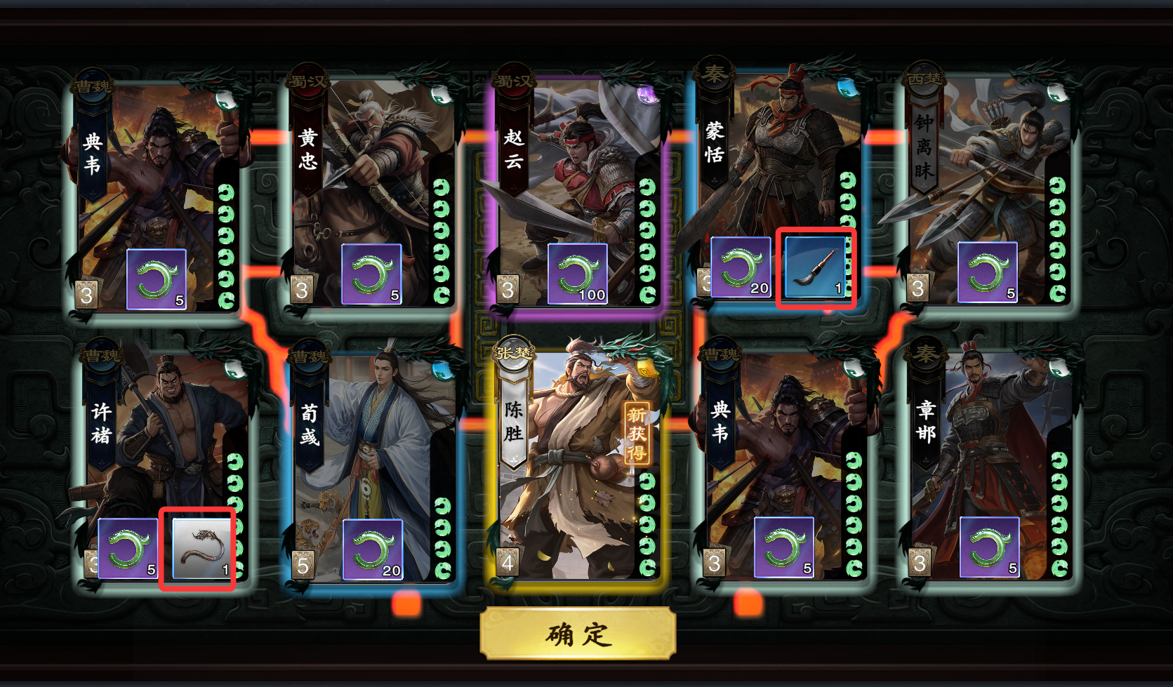 在招募获得相同武将时,概率获得对应武将的专属信物。每个武将均有“初、地、南、东、西、北、天”阶数,升阶后可提升战斗优势、战斗表现、战斗属性。