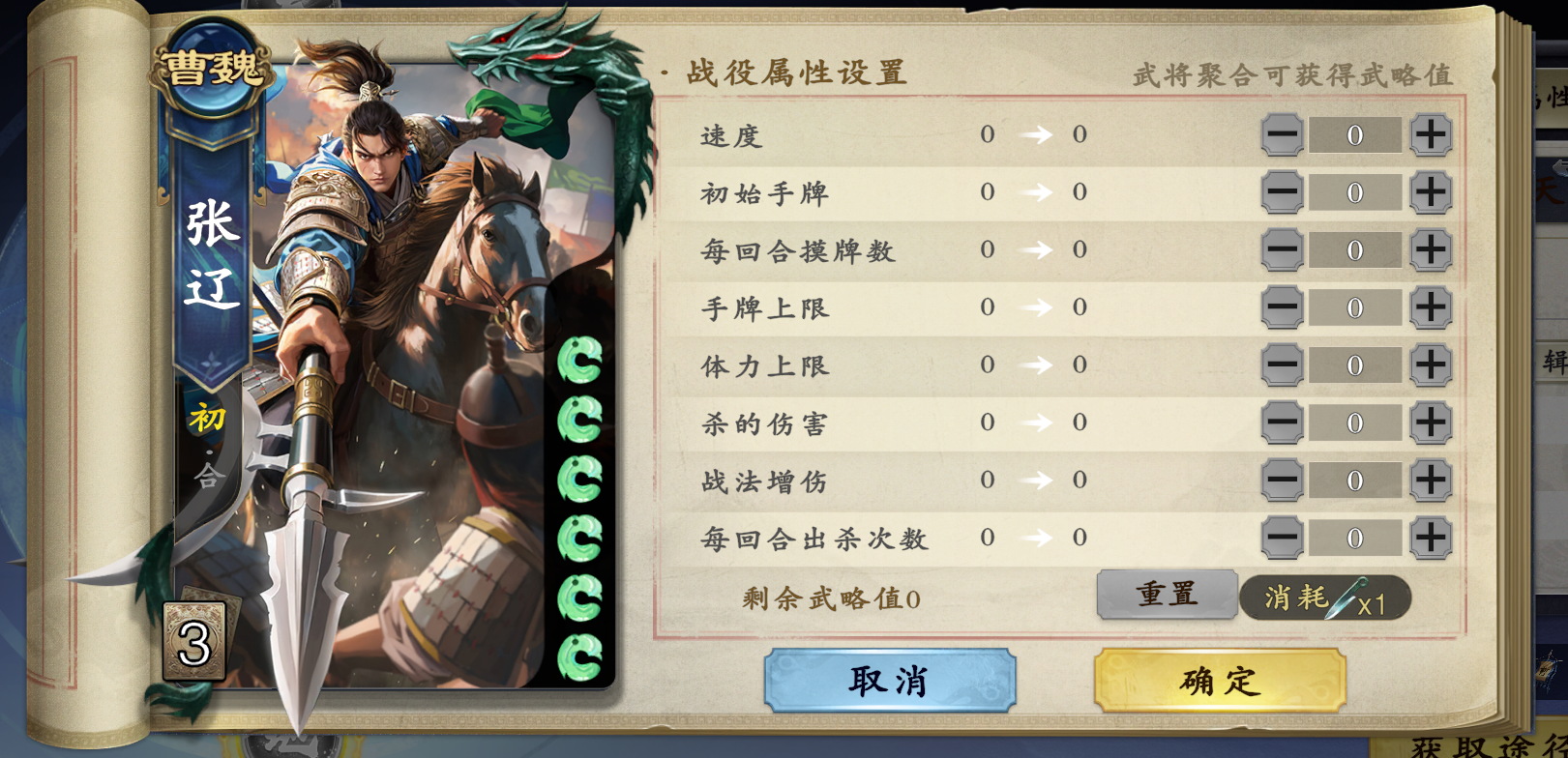 速度:影响武将起手顺序,主要是用来千里单骑,每个武略点可提升1点速度。