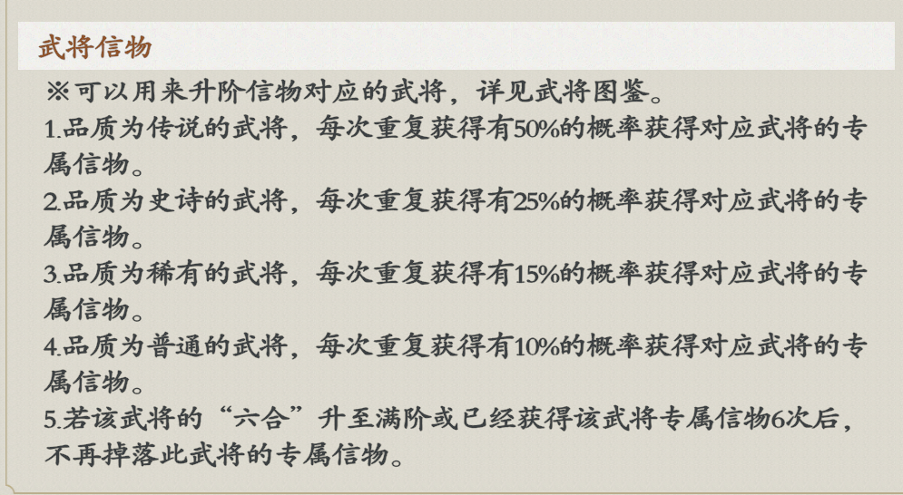 获得2次及以上相同武将,必定获得相应的玉猪龙,而专属信物是概率获得: