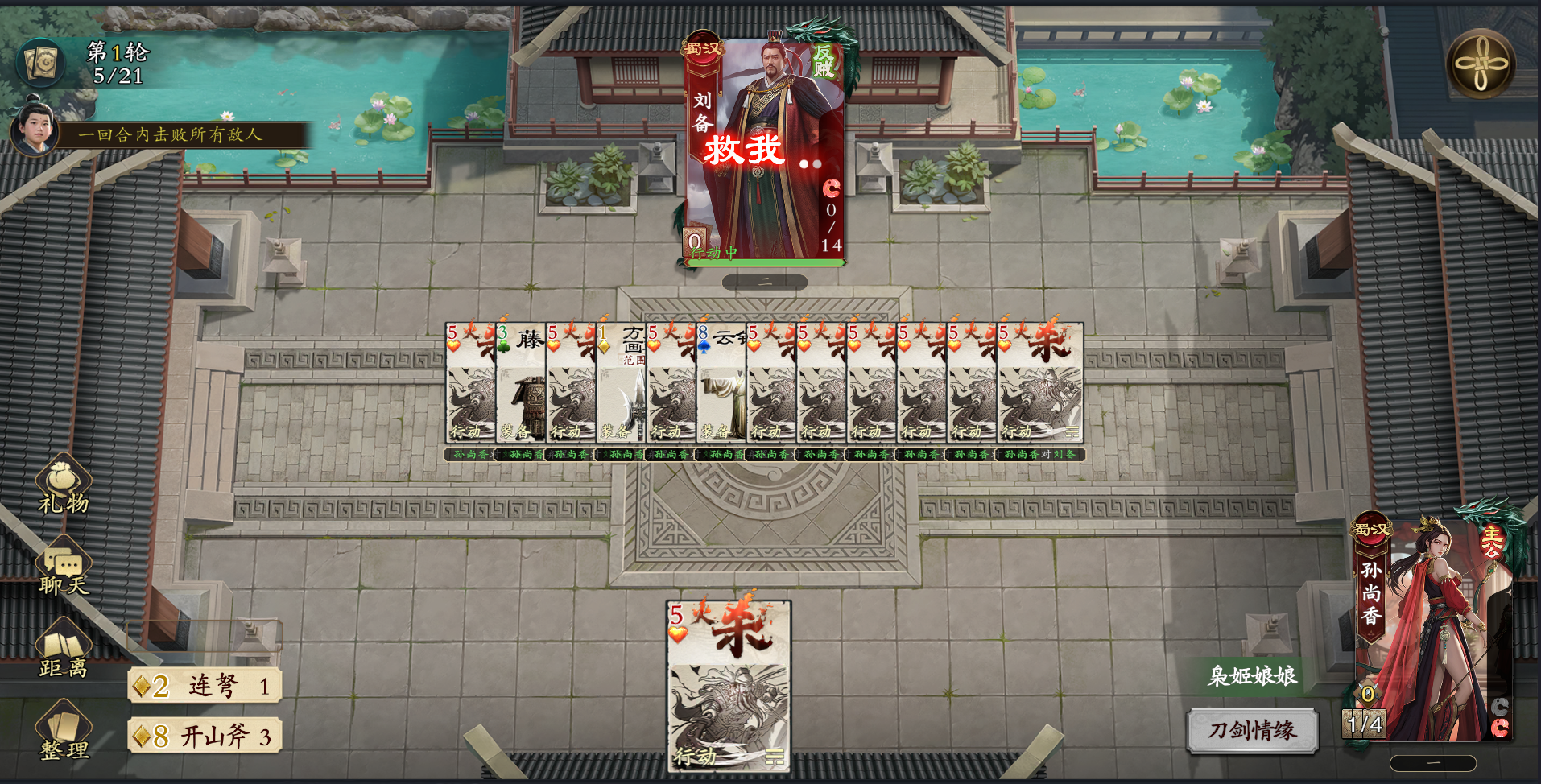 3、对刘备出杀,弃置除“开山斧”、“诸葛连弩”以外的装备会触发“开山斧”+1伤害效果,随后选择触发诸葛连弩,随后一直出杀,在手牌剩余1张杀时弃置“诸葛连弩”来提升1点伤害,即可在1回合内斩杀12血的刘备。