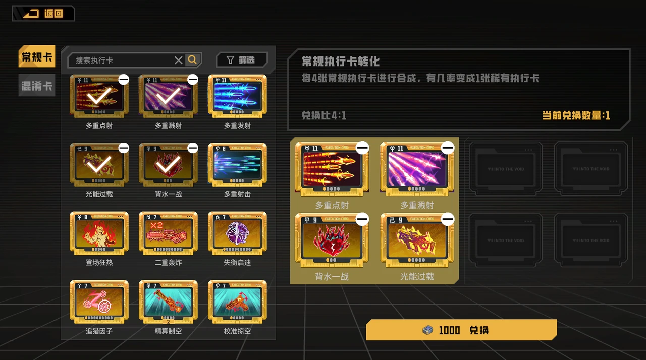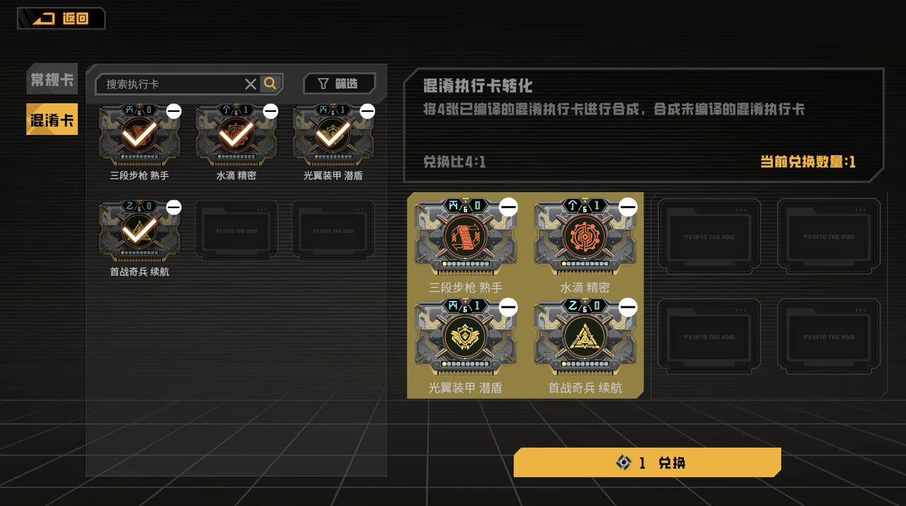 (该功能位于烧录机-逆编译,UI为效果展示图,具体请以上线内容为准)常规执行卡:消耗四张常规执行卡和适量的新联币进行逆编译,有概率逆编译成更稀有的卡。