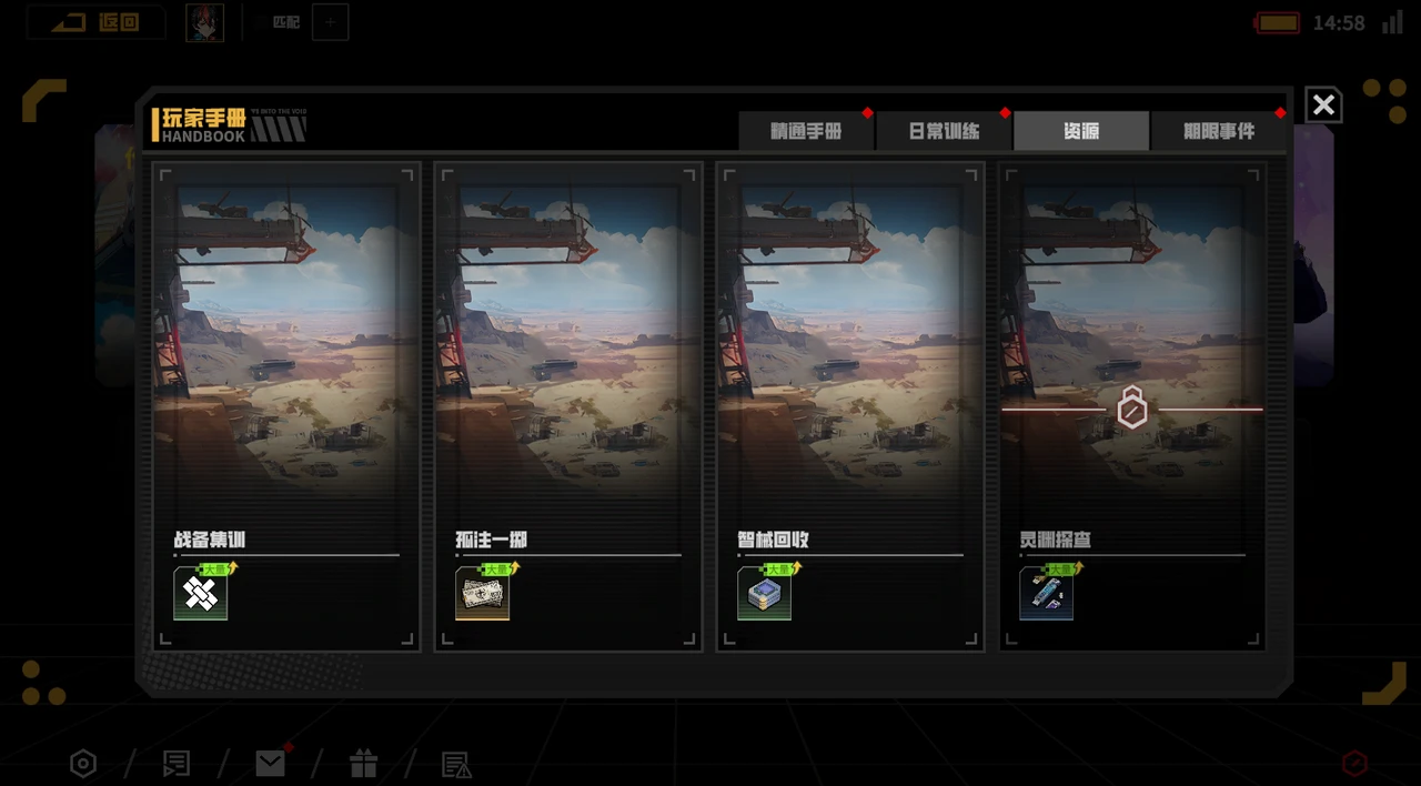 在手册界面,重新优化了四种基础资源关卡的入口和界面