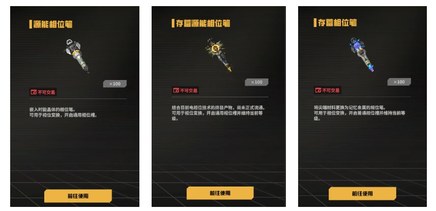 - 存蓄相位笔:可用于相位变换,开启普通相位槽并维持当前等级
