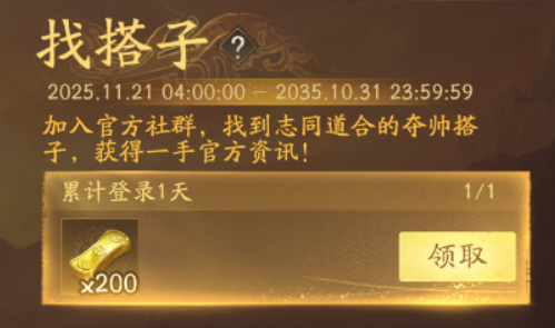 找呀找呀找搭子,找到一个好搭子!现在打开游戏内“找搭子”页面加入官方社群,即可领取200金锭!
