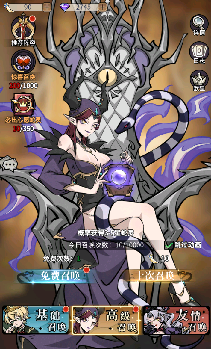 虽然氪金能较大提升体验,但请大家根据自身情况合理氪金,如果有氪金的打算,微氪党建议:只氪蛇王战令,蛇王战令里面有神话级英雄自选,在前期能提升过图速度并且蛇塔试炼中刷碎片很关键。其次蛇王战令里面有很多稀缺资源,如进阶晶球后期巨缺。激活蛇王战令的同时还会激活大小月卡方便我们快速积攒钻石资源。至于大佬,就随心情,优先选择觉醒材料和装备即可。