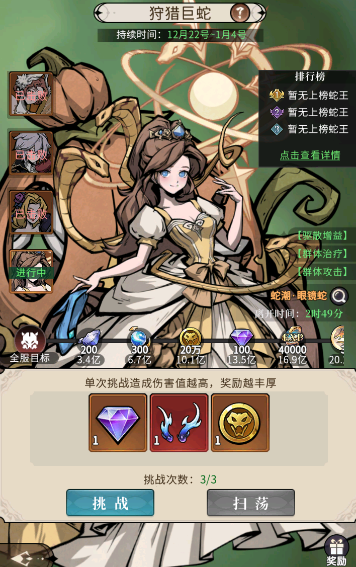 首先就是前期成长路线,新手前期可以优先去完成主线,主线不仅能帮助大家掌握世界观和基础玩法,还能拿到大量的“蛇牙”和“钻石”,这样可以用于唤灵大师之中,来快速获得各种角色加快阵容的组成,有了强力阵容后就可以去参与“童话阶级”、“蛇塔”和“狩猎巨蛇”,“狩猎巨蛇”需要挑战巨蛇boss,打出的伤害越高奖励越高,每日每人有3次挑战机会,周六日无法参与,挑战完毕后能拿到龙纹系统的养成材料,提升大量的基础属性;“蛇塔”需要根据自身的战力来积极爬塔,从中可以获取大量的蛇灵装备提升战力,“童话阶级”是大家前期要做的成长主线,通过完成阶级任务可以提升阶级,获得资源和属性提升。