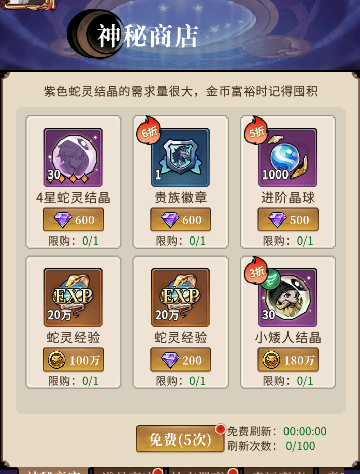 最后就是商店的购买,到了后期大家都积攒了一定的游戏货币,但是对于兑换优先级好多萌新可能不太明白,对于蛇灵商店来说,优先兑换爱丽丝,爱丽丝这个设定可以用到大后期,而无尽商店必买魔法水晶,最后不推荐购买徽章(徽章可以通过蟒蛇杯商店购买),关于神秘商店这里优先推荐购买蛇牙和幸运蛇牙,像进阶晶球则是需要看自己的需求进行购买,中后期不推荐购买,后期可直接购买,对于奇珍商店,则只需要购买无脑蛇心硬币即可。