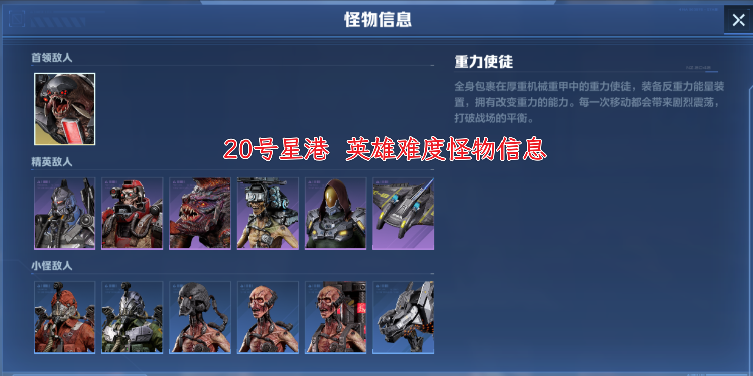 20号星港难度分为普通(5关)、困难(7关)、英雄(9关)、炼狱(9关)及挑战(9~)难度,根据难度划分,出现的怪物也将不同,其中: