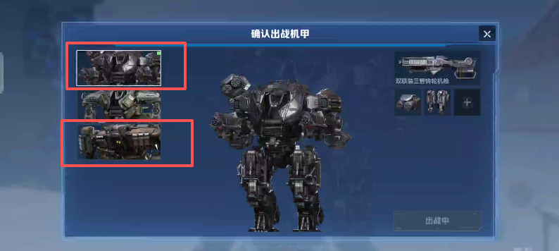 游戏内机甲并不会显示其名称,在机甲的选择页面中,从上至下分别为暴风机甲、巨兽机甲以及火线磐石机甲。