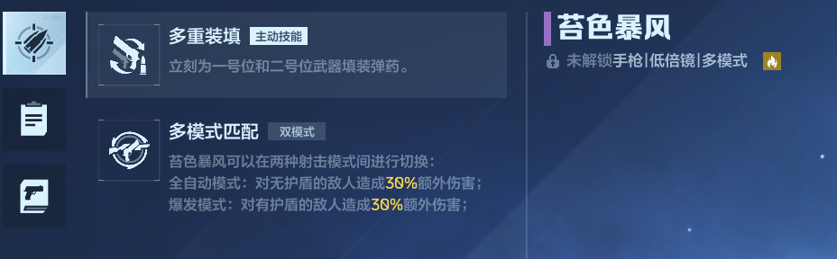 这里以纯白至上进行举例,它的主动技能为获得15秒的减伤和持续射击获得增伤效果,需要保持射击才能获得增伤,停止射击增伤将消失,而被动则是提升射击速度。