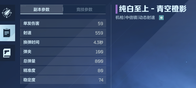 再来看纯白至上的属性参数,它的前置弹匣仅有100发,后置为800发,而且是机枪,这15秒的增伤根本吃不满,而且还有射速提升,100发子弹可能5秒都坚持不了。