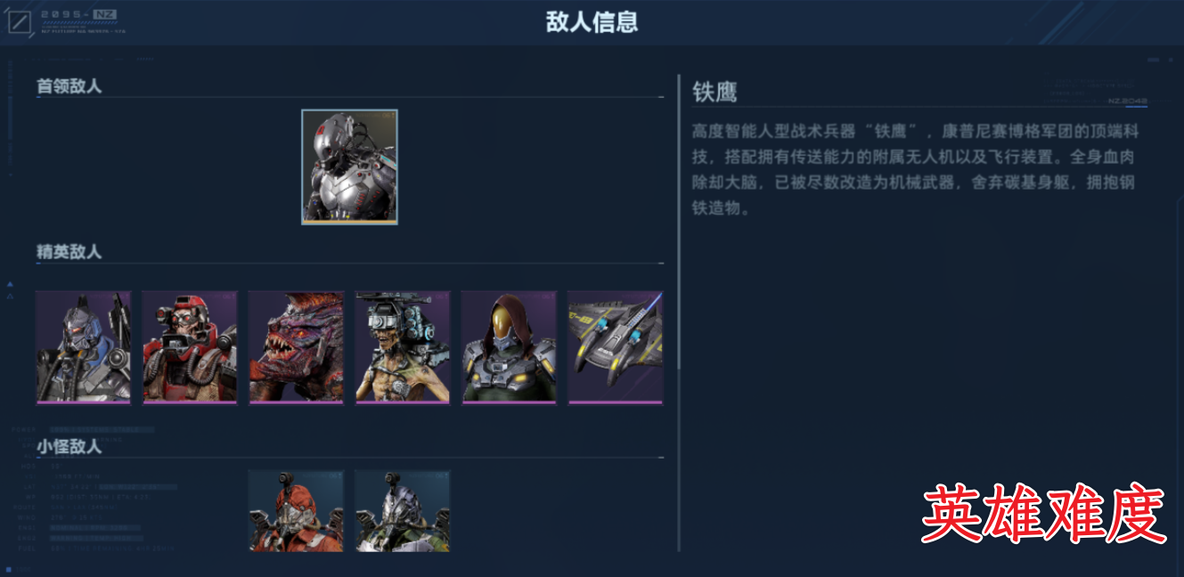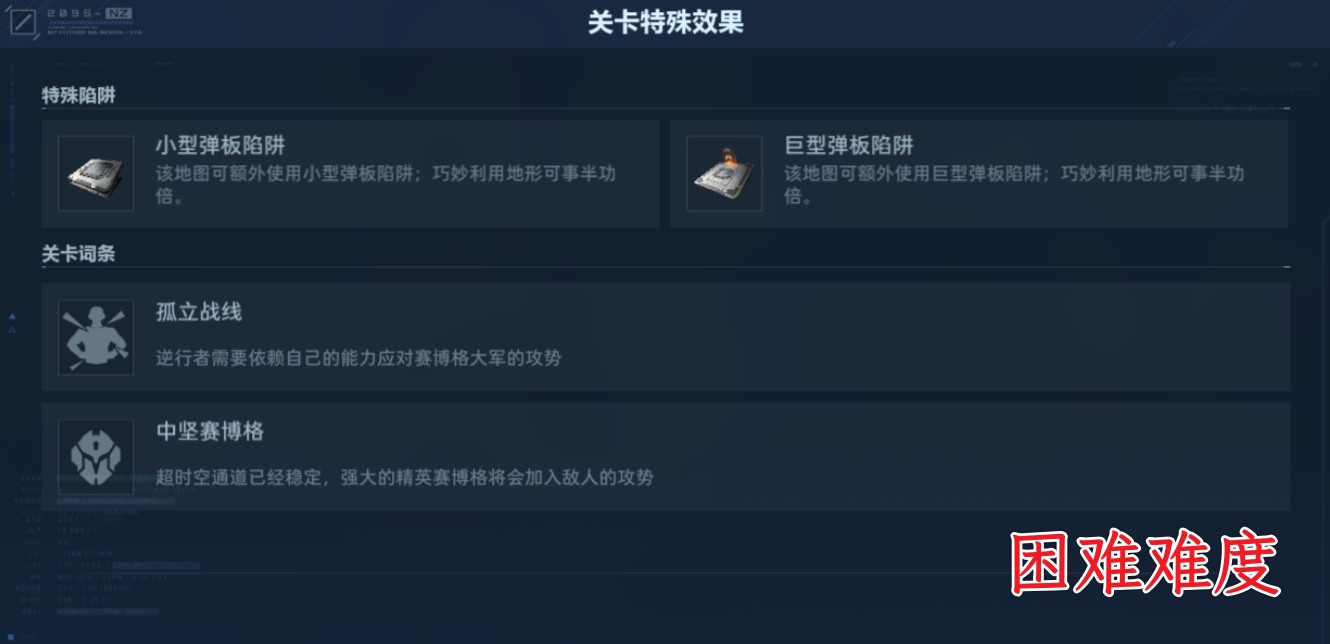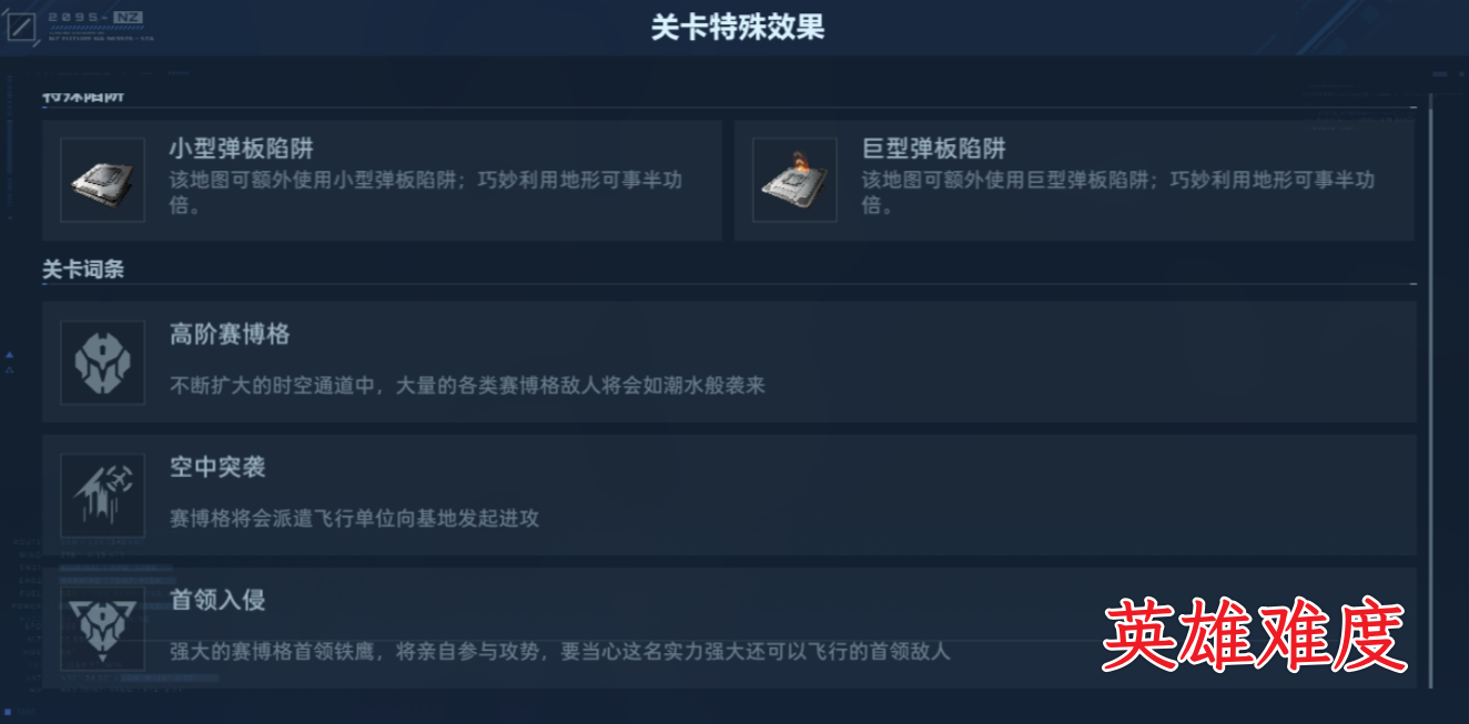 这里也可以明显的了解到是否有BOSS及推荐的陷阱和敌人信息,如困难难度就是中坚赛博格,而英雄难度不仅提升为高阶赛博格,还会有空中突袭和首领入侵,了解后逆行者们就可以提前进行对防空的布置及商讨对BOSS的攻略办法。
