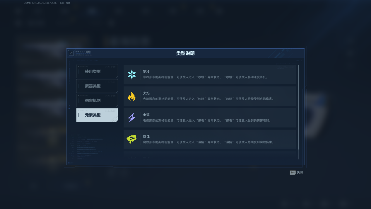 武器元素分火焰、寒冷、电弧、腐蚀、物理五种,图标分别为黄色火焰、蓝色雪花、紫色闪电、青色骷髅脸、白色菱形。火焰可使敌人进入“灼烧”异常状态,“灼烧”可使敌人持续受到火焰伤害。寒冷可使敌人进入“冰缓”异常状态,“冰缓”可使敌人移动速度降低。电弧可使敌人进入“感电”异常状态,“感电”可使敌人受到的伤害增加。腐蚀可使敌人进入“溶解”异常状态,“溶解”可使敌人持续受到腐蚀伤害。物理形态没有特殊效果。