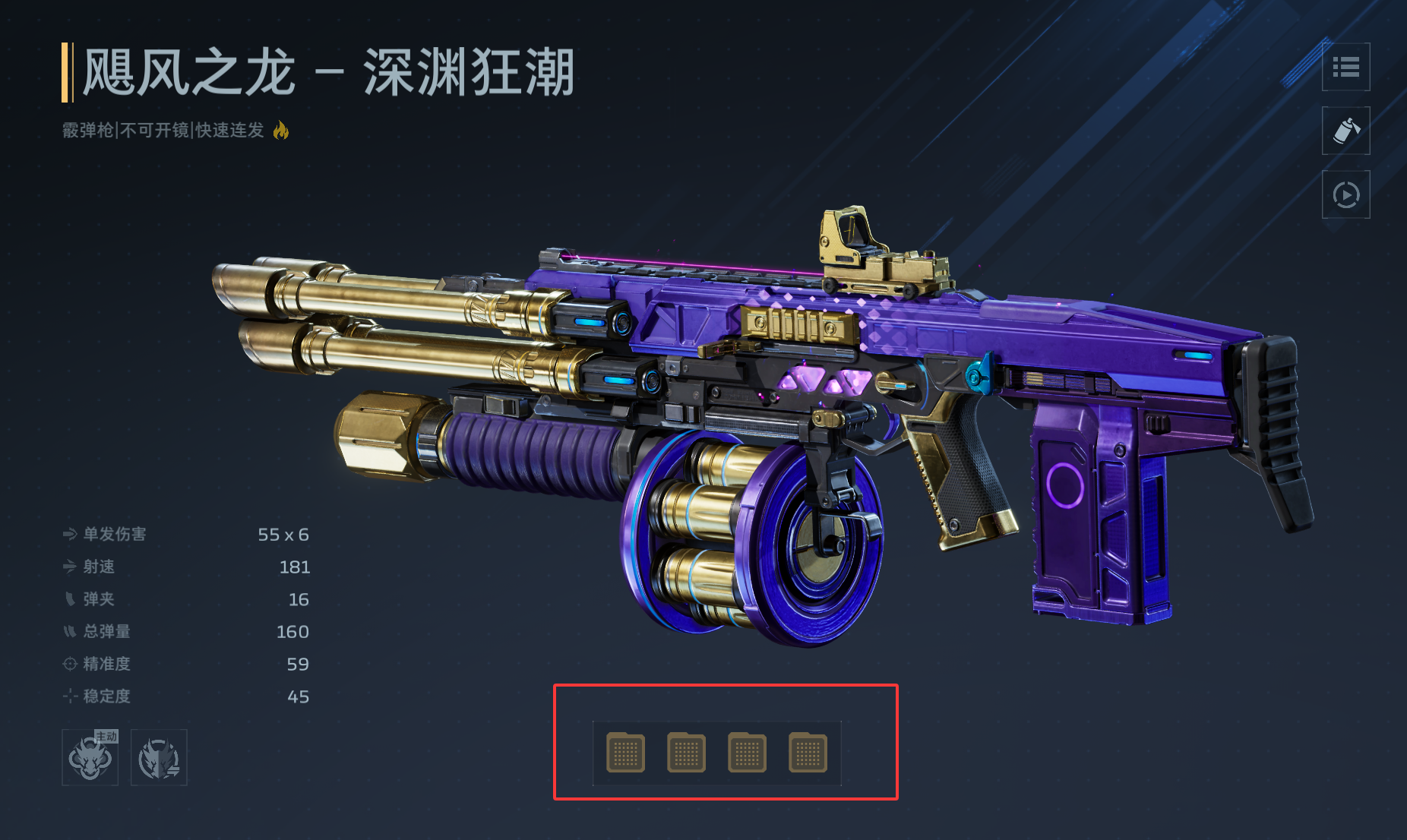 插件可装配在主武器与副武器上,每个位置只能装配1个对应位置的插件,每把武器有4个插件位,不同插件提供不同特性效果。插件同样有品质区分,稀有(蓝色)、史诗(紫色)、传说(金色),仅有传说插件可以制造。如果想了解更多插件信息,可以在插件图鉴中查看。注意,插件会在新赛季重置。