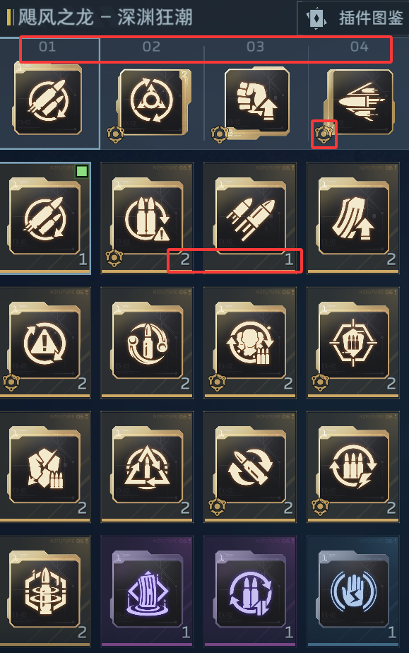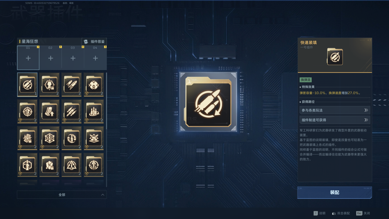 点击插件位1234,系统自动识别对应插件,双击即可装配或替换,不需要自己查看是几号插件。插件左下角的圆形三角是限定武器标志,意味着该插件仅某种类型武器可装备。插件右下角的数字为该插件数量,并非插件位置。