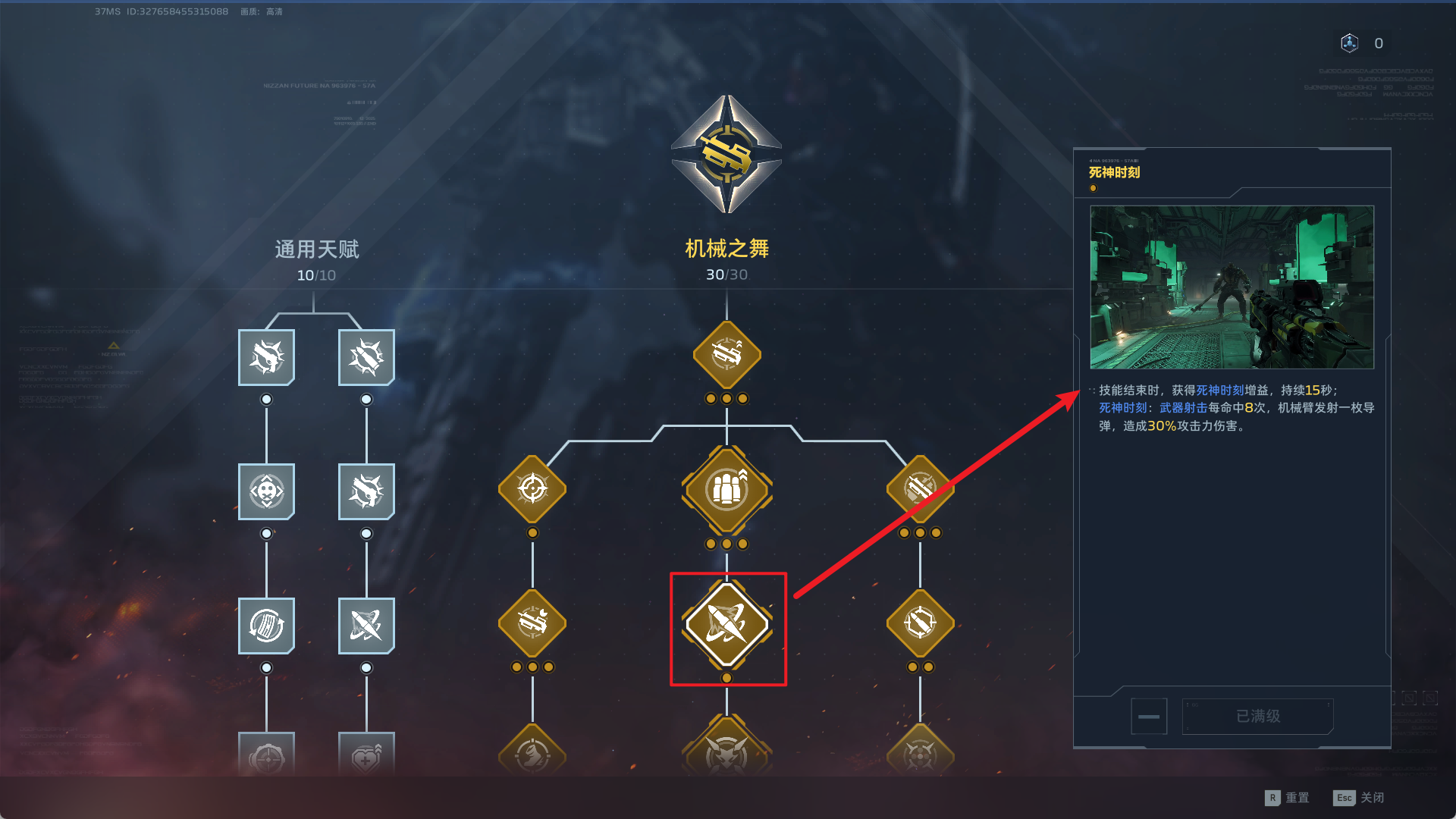在天赋方面,优先选择与冲锋枪适应的机械之舞,并优先点出死神时刻(射击反馈)和右侧的武器之歌(增伤)。