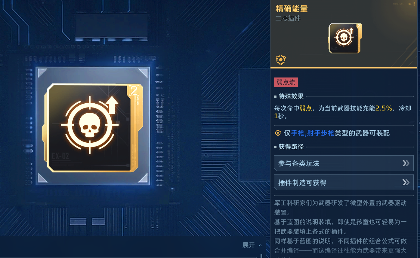 精确能量属于弱点流插件,该插件只能手枪和射手步枪使用,每次命中弱点都可以为当前武器充能2.5%,有一秒的冷却时间。