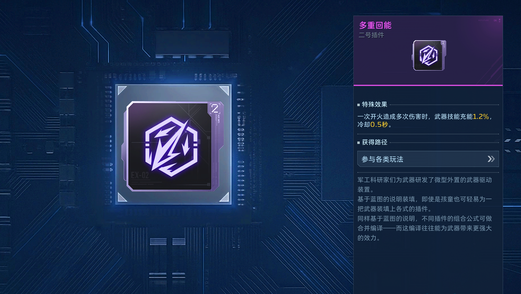 该插件由于依靠暴击来为主动技能充能,因此在天赋以及其他插件方面,优先以增加射速以及拉高暴击率为主,用更高的射速以及几率获取暴击以此来保证自身技能可以快速刷新。