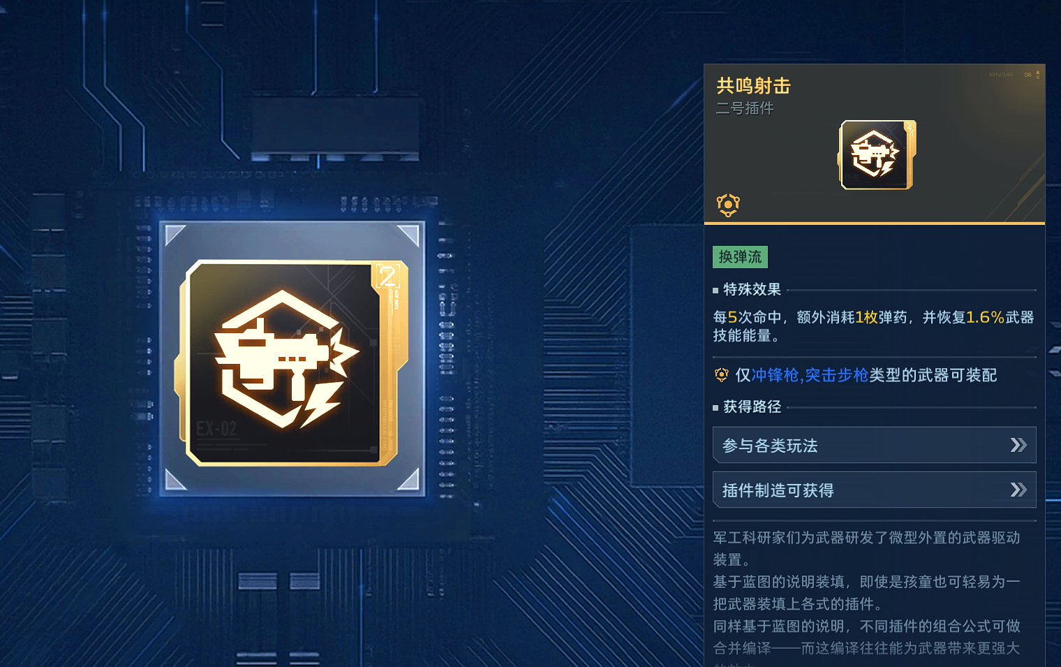 该插件适合依靠技能加成的换弹流武器使用,有了该插件后,自身技能冷却时间会大幅缩短,其他三个配件可以在增伤方面进行搭配。