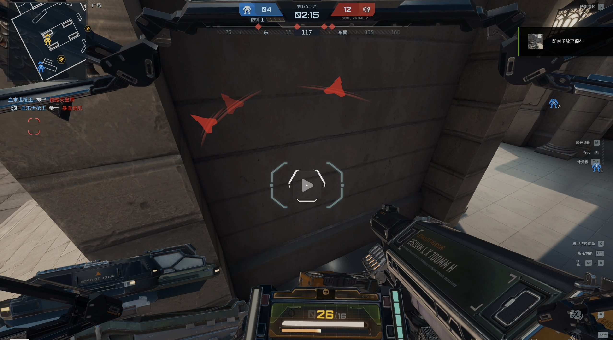 第二个点位在东侧复活点南边的小道,站在这里可以直接扫射到所有复活的敌人,并且敌人想要消耗你,就必须要出来,很容易拿到人头。如果这里的人头被收割完了,还可以开启爆燃冲锋,进行长时间的冲锋来到高台前面的复活点收割部分人头。
