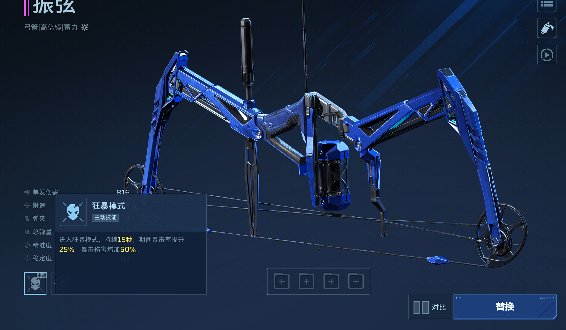 副武器选择振弦,释放技能后可以进入狂暴模式,持续15秒,在这15秒的时间内,我们的暴击率可以提高25%,暴击伤害提高50%,攻击精英怪和BOSS时,能够造成大量伤害,尤其是将BOSS打出破韧状态后,死神猎手结合振弦的主动技能更是可以在短时间内消耗BOSS大量的生命值。