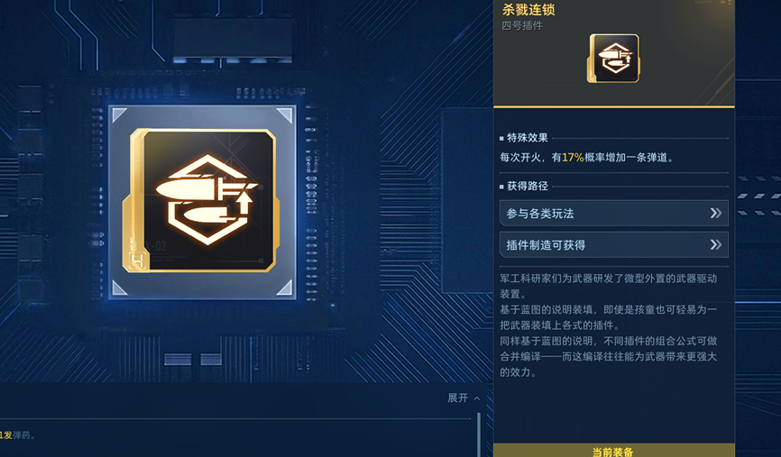 第四个插件选择杀戮连锁,每次开火都有17%的概率增加一条弹道,相当于能够打出双倍伤害,在将BOSS破韧之后,借助额外多出的一条弹道能够迅速打掉BOSS大半血量。