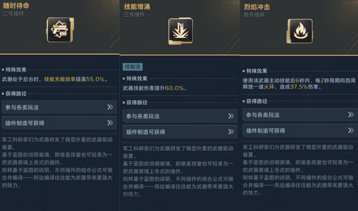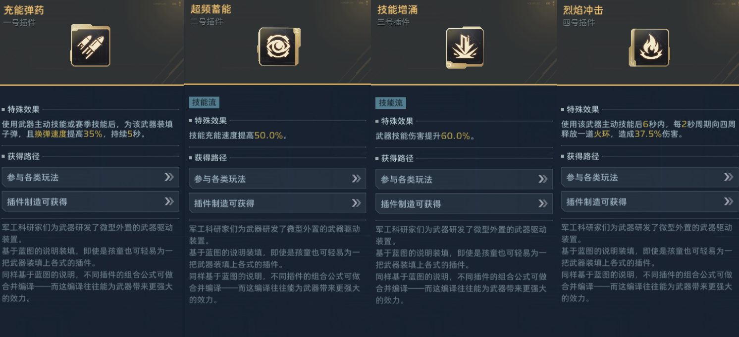 1、前期推荐搭配思路:前期如无法高效获取金色品质插件,可先用紫色插件过渡,重点提升“弹夹容量”和“技能伤害”。