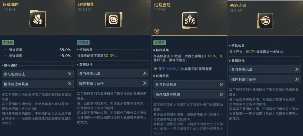 1号插件“超载弹匣”,提升55%弹夹容量,略微降低换弹速度。