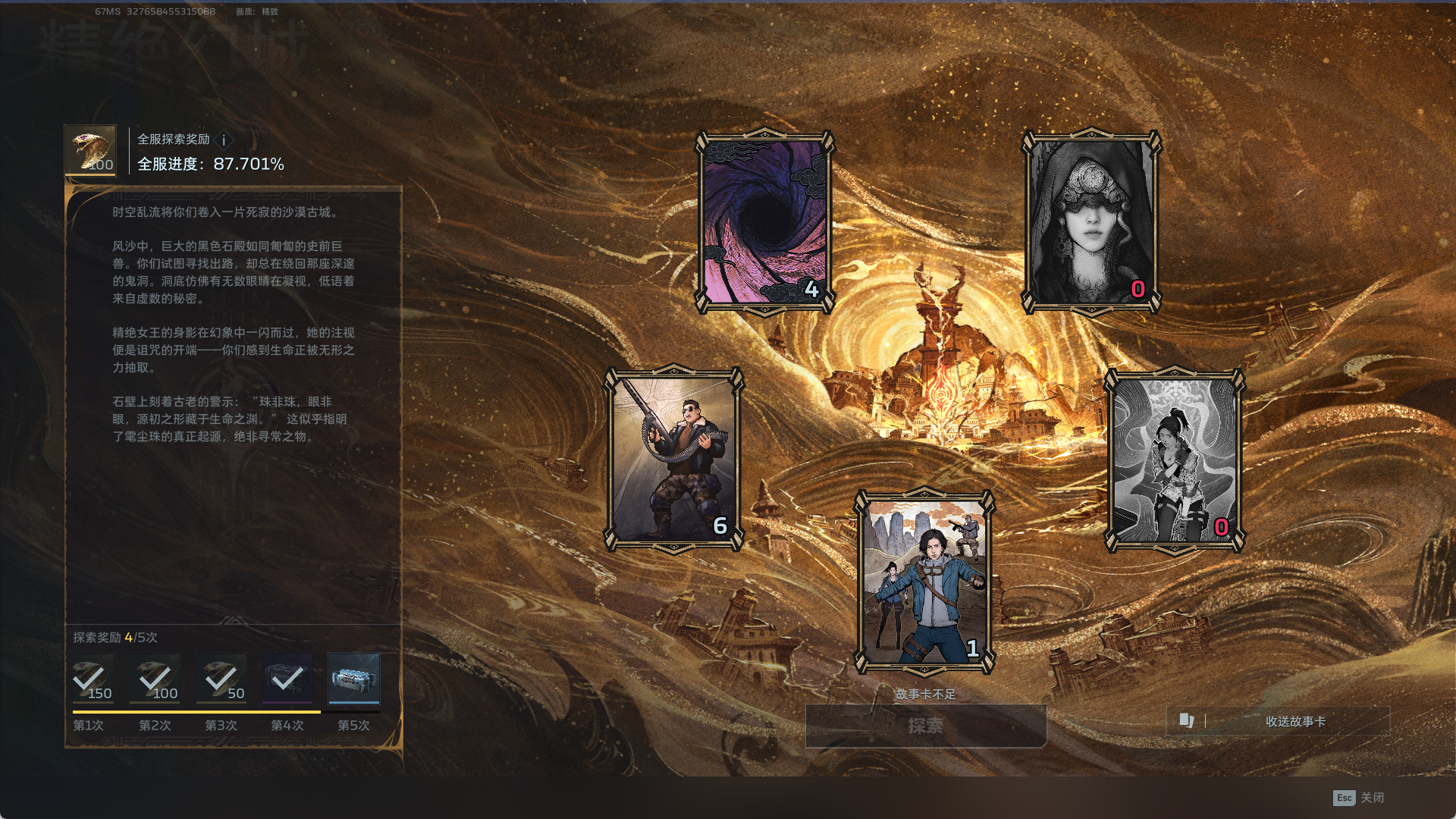 逆行者还可通过右下角“派遣获得故事卡”功能,选择区域进行派遣,20小时后可获该区域的随机故事卡2张;若全服进度达100%,派遣后可额外获得3张故事卡。