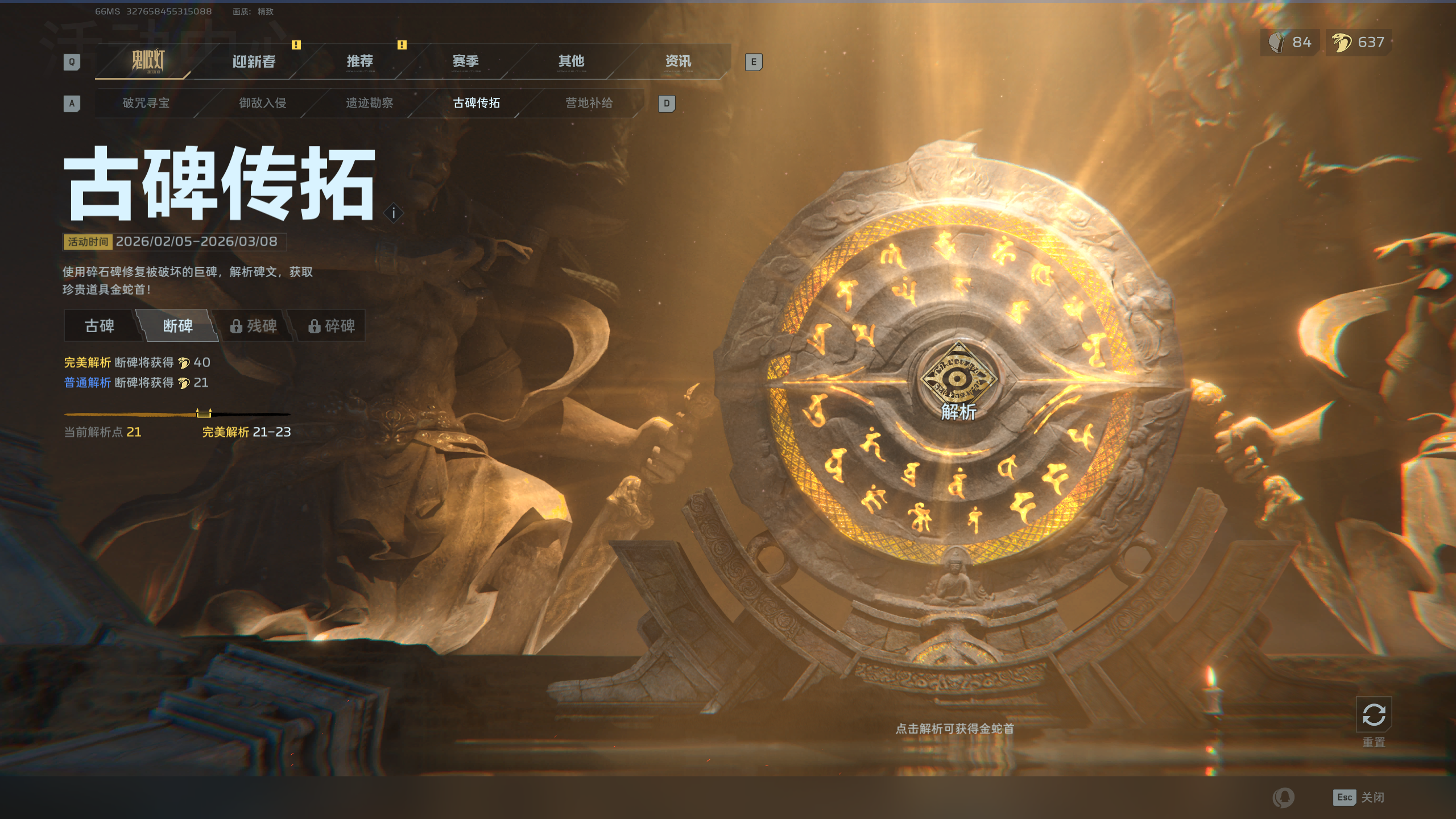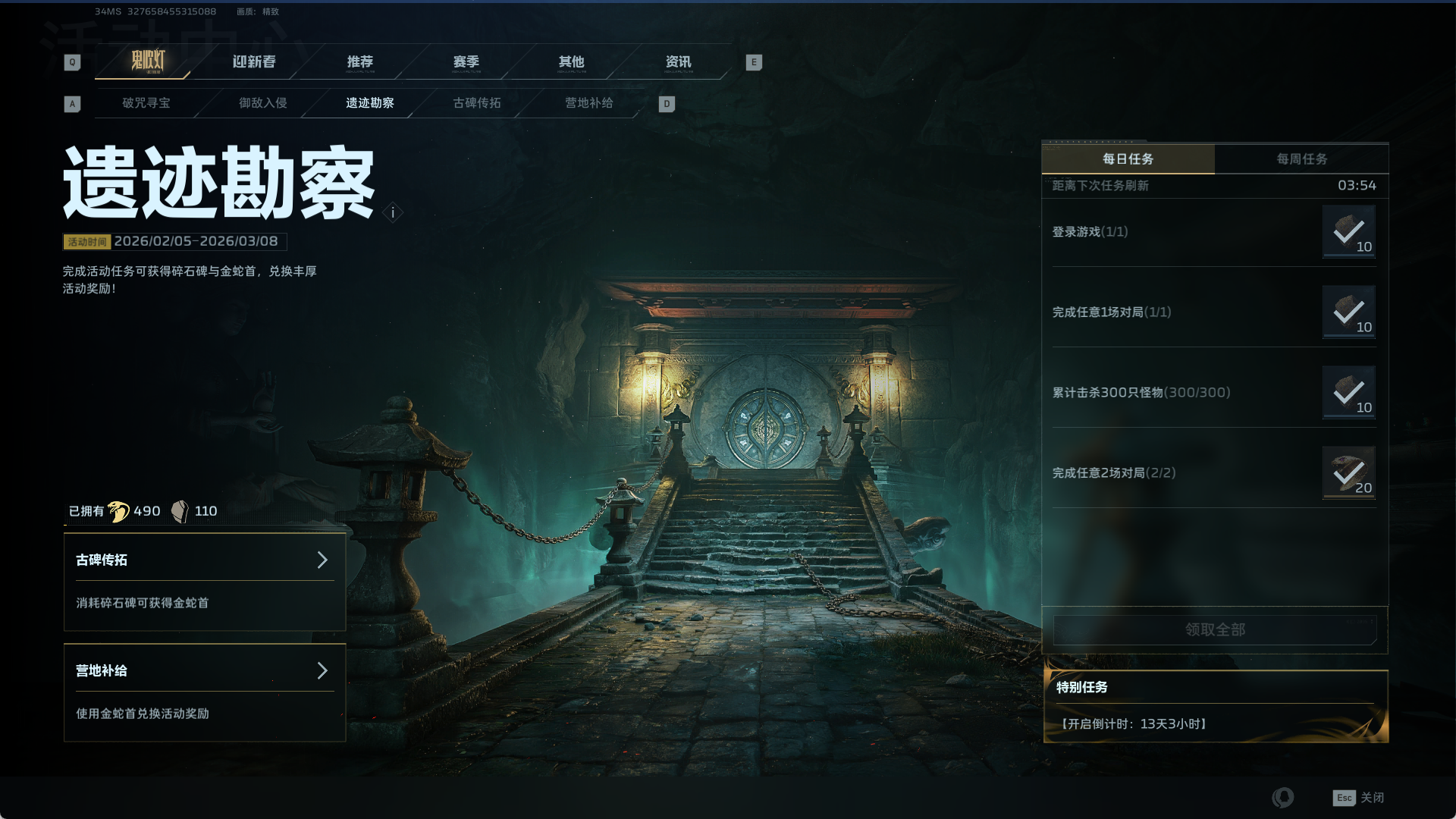 遗迹勘察通过完成右侧每日/每周任务获取碎石碑与金蛇首。
