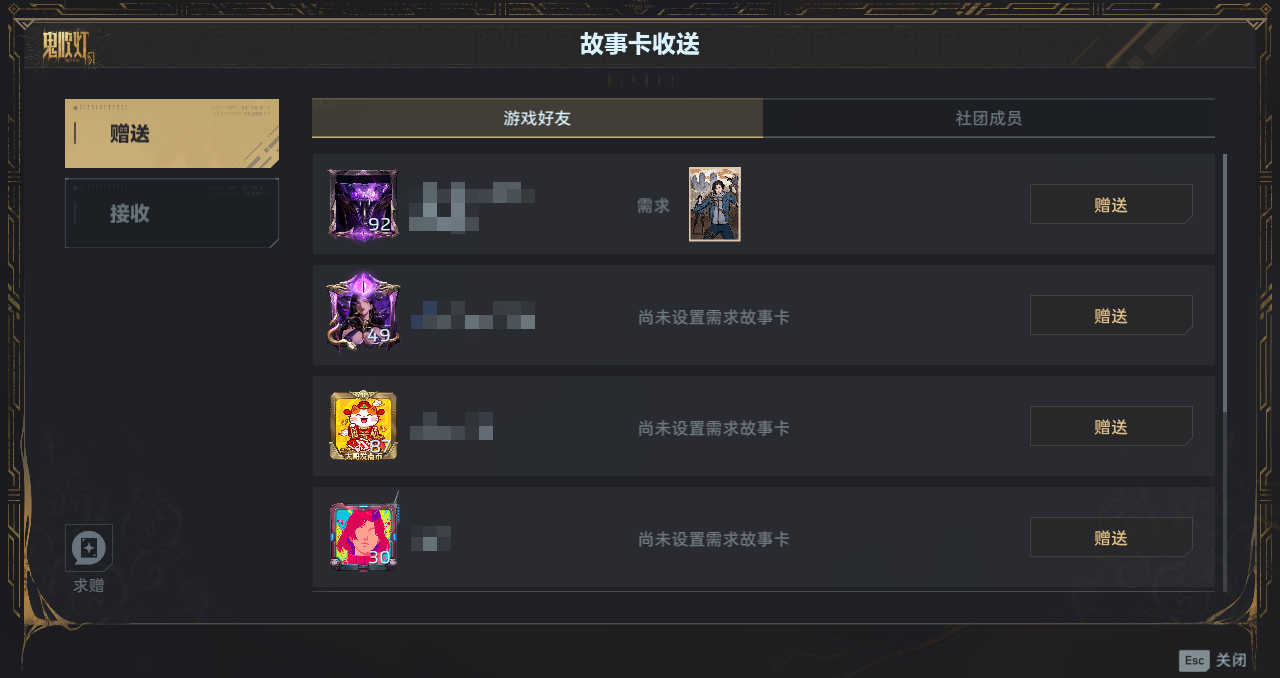 若缺少特定故事卡,可点击左下角“求赠”功能,方便好友协助。