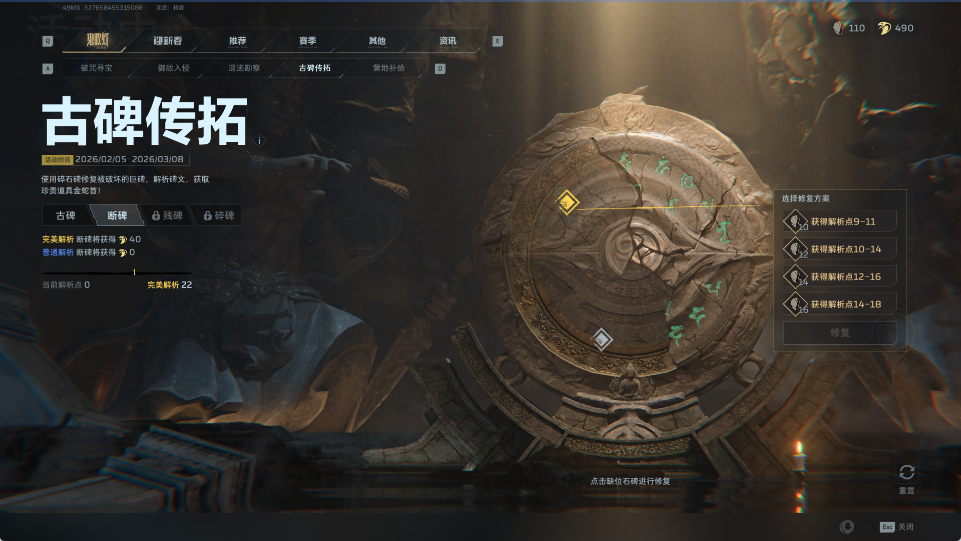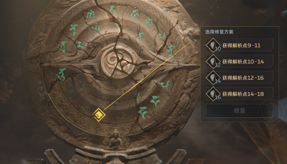 逆行者们可选择不同修复方案,消耗碎石碑数量与获得解析度区间各异。若解析未达完美,可点击右下角“重置”重新操作。