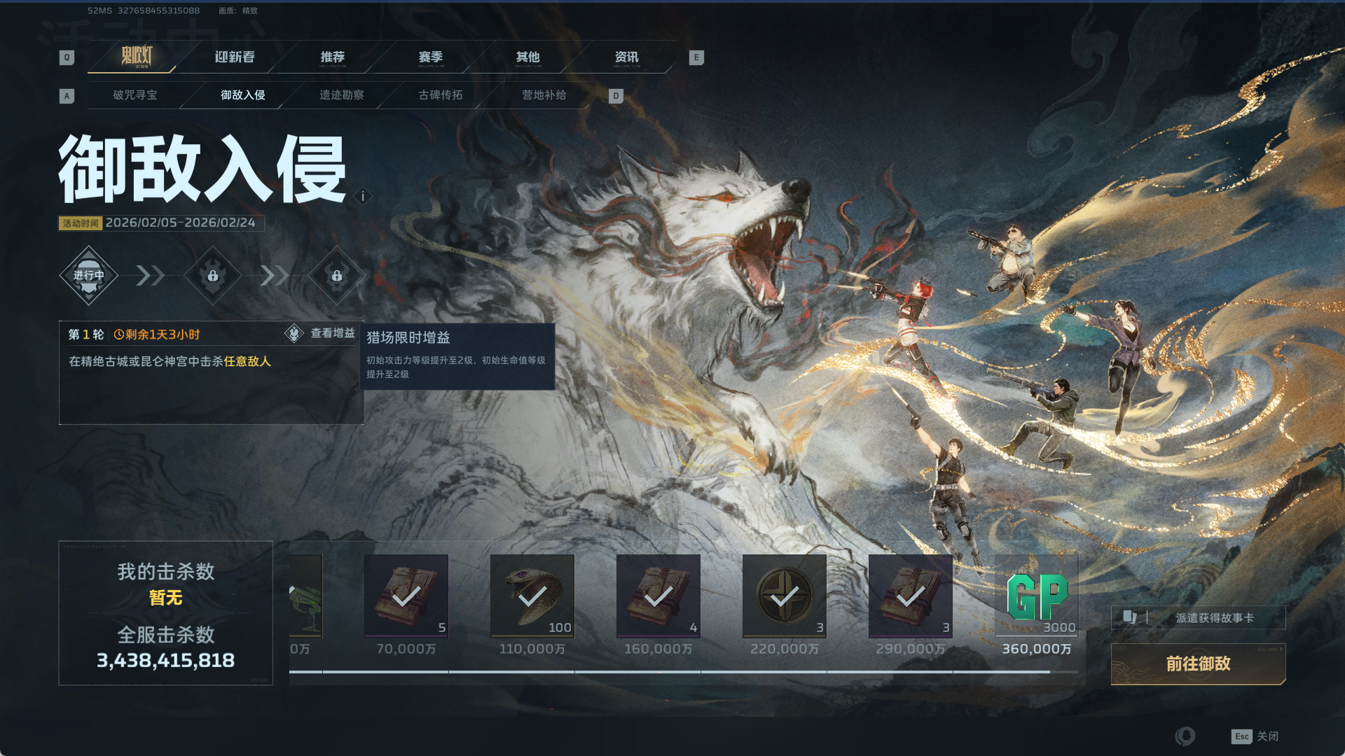 御敌入侵逆行者们需完成左侧指定任务,例如首轮任务为“在精绝古城或昆仑神宫中击杀任意敌人”。活动期间还会提供对应增益效果,如首轮增益为“猎场初始攻击力与生命值等级提升至2级”。