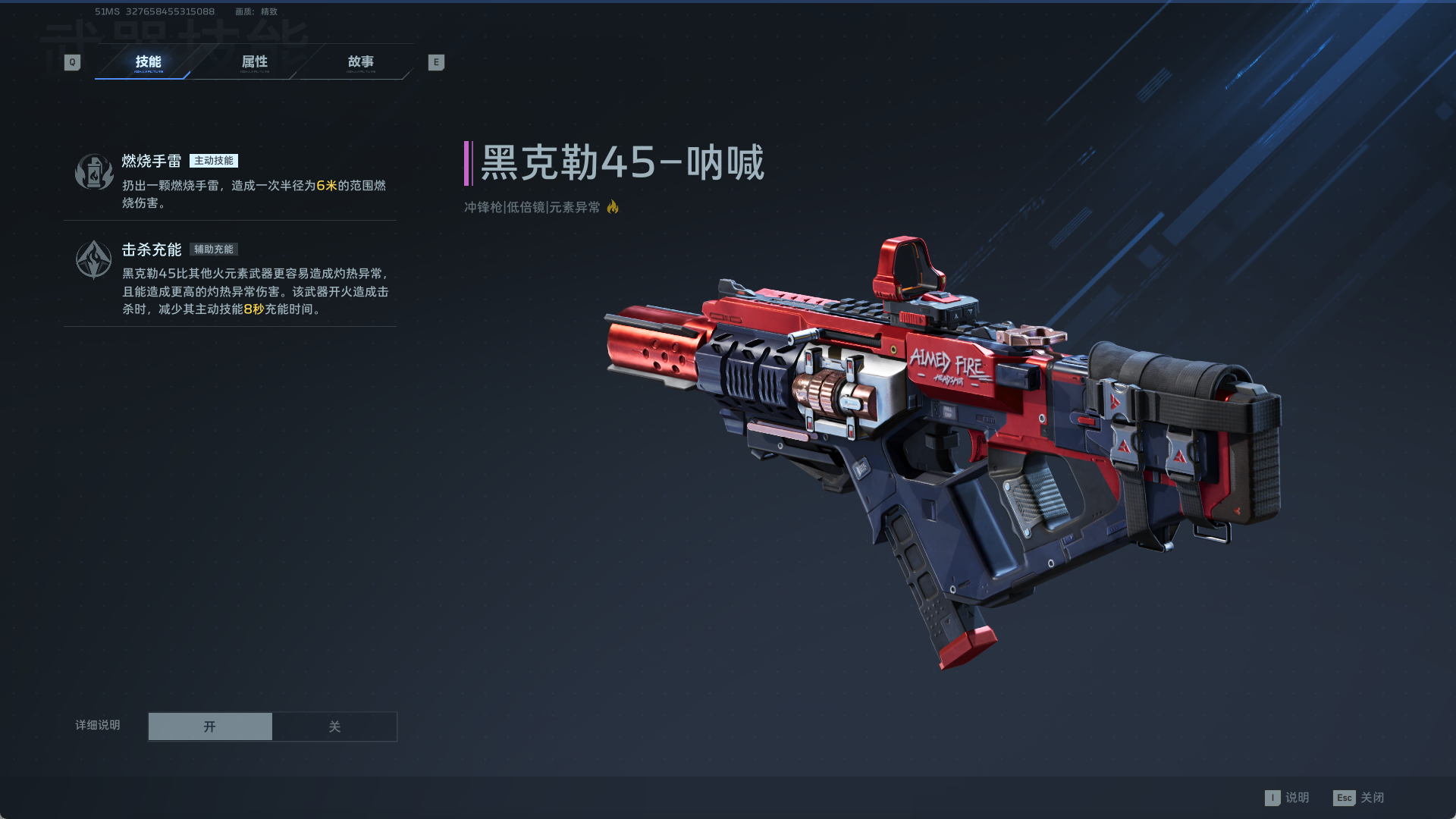 黑克勒45-呐喊:可投掷燃烧手雷,造成半径6米的范围燃烧伤害,较易触发灼热异常,且灼热伤害更高。击杀敌人可减少主动技能8秒充能时间。
