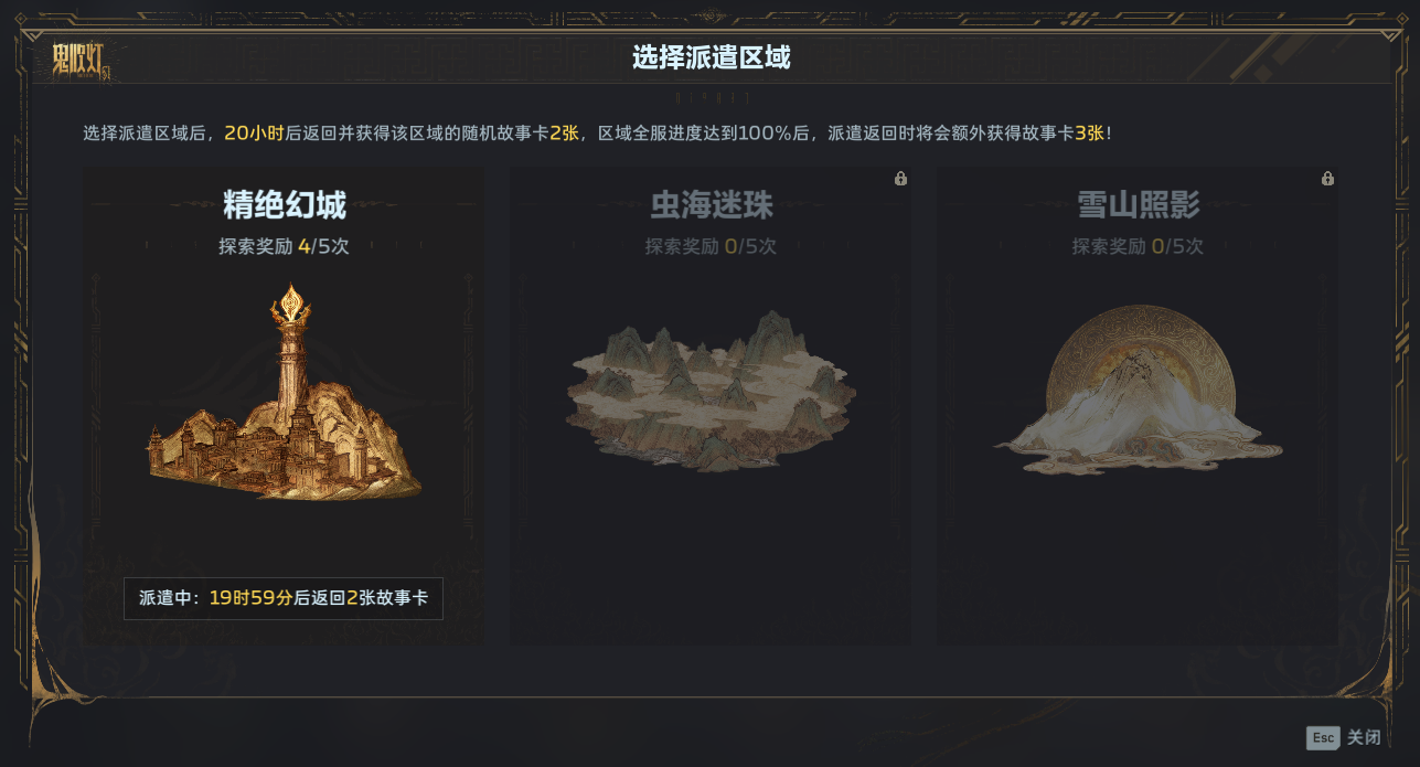 逆行者还可通过右下角“派遣获得故事卡”功能,选择区域进行派遣,20小时后可获该区域的随机故事卡2张;若全服进度达100%,派遣后可额外获得3张故事卡。