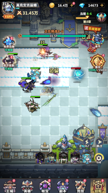 1.主界面右下角【冒险】入口,点击后进入冒险界面,点击右下角的【挑战】按钮后进入当前关卡副本战斗。通关后可继续挑战下一关,每挑战成功关卡BOSS后即可进入下一章节。