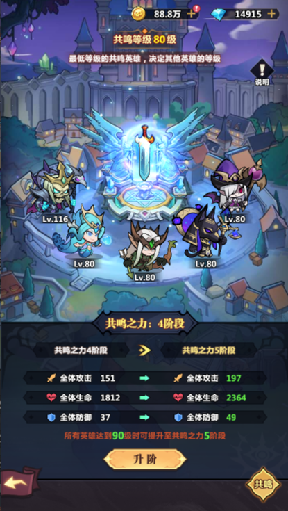 6.英雄等级共鸣:上阵英雄中最低等级英雄的等级作为共鸣等级,上阵的五个英雄等级达到一定阶段时,可进行提升共鸣等级获得属性加成。