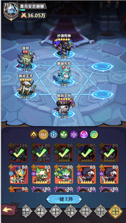 5.英雄上阵最多只能上阵5个,布阵功能则为玩家提供便利操作,可在每个玩法挑战前提前布置好需要上阵的英雄。
