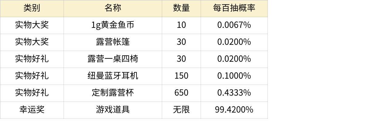 - 活动期间,玩家通过【游戏内-潜水船坞-进行潜水打捞】,开启藏品宝箱的同时,获得抽奖次数(单日上限5次,不累计,每日0点清空),并在指定的转盘活动处进行抽奖,即有机会随机获得实物奖品兑换道具;