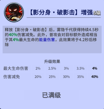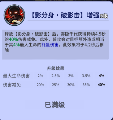 ≈ 技能加点:2,3,4,主4技能【影分身·破影击】增强,释放技能后持续4.2S的普通攻击额外造成4%最大生命值的能量伤害