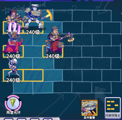 利用大帝开局护盾抵消第一波攻击,机器人冲到后排吸引第二波攻击,千代跟兰博的位置可以进行调换,对位敌坦克,机器人同理