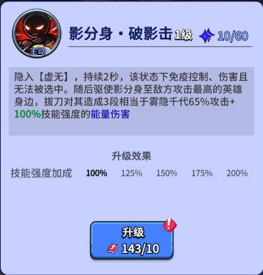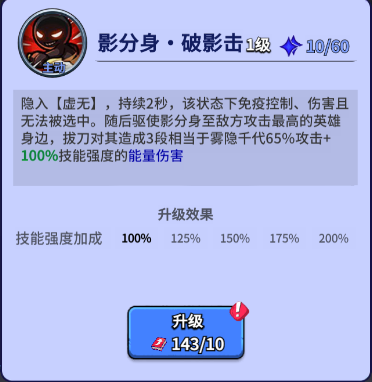 ≈ 技能加点:1,2,3,主1技能【影分身·破影击】,对敌攻击最高的英雄造成3段的能量伤害【能量伤害为混伤,由攻击65%+技能强度200%】
