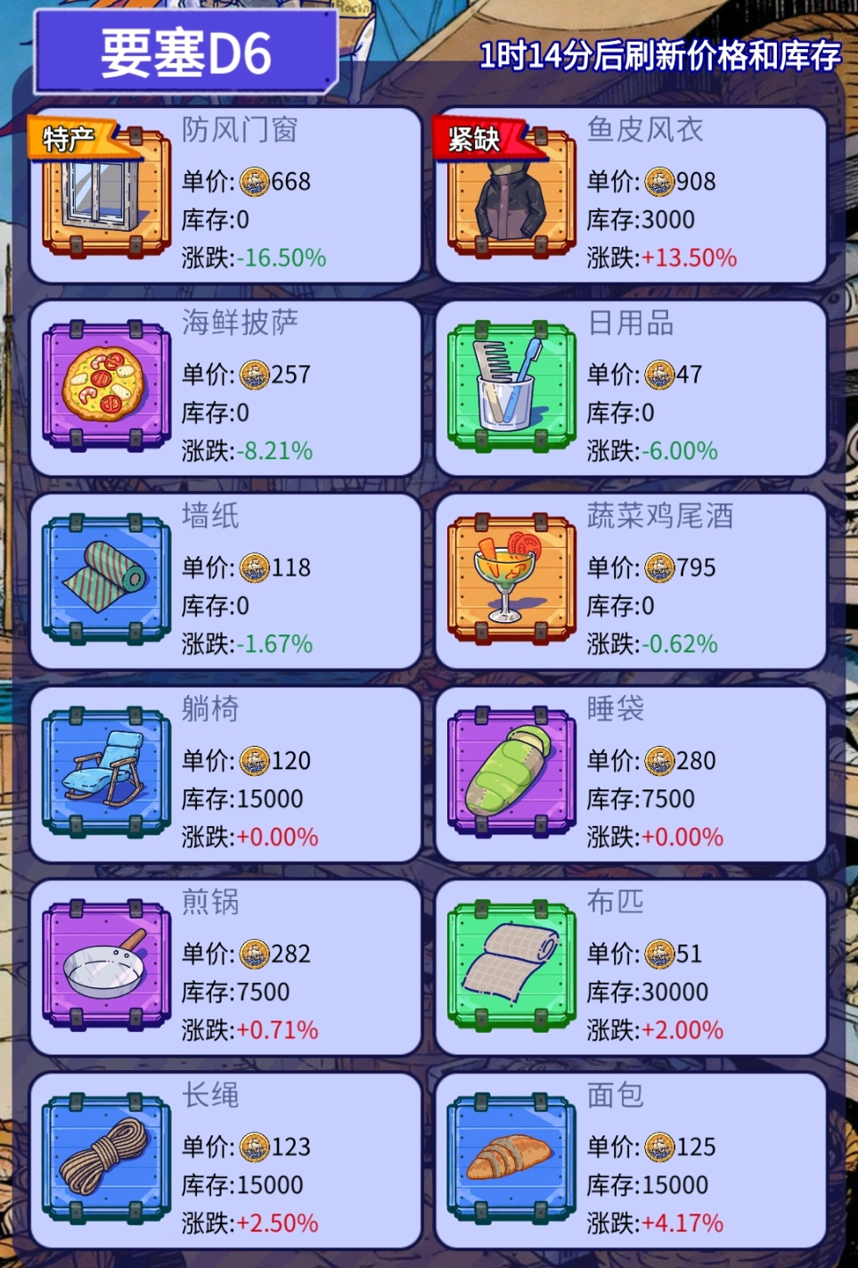 举个例子:10:00–12:00 是一个时段,你在 11:50 抵达 A 城,发现这里的橙色货物+特产没人买,直接买空。如果船舱还有空位,可以等到 12:01,A 城会刷新新一轮库存和货物,你就能在同一座城再买一批再出发。