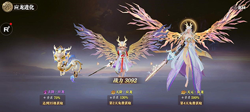 玩家可以通过培养进阶提升战灵属性、技能等级和外形特征。战灵装备来源包括太古神兽、轩辕帝陵、高级召唤等玩法,可提升战灵的输出、防御等各方面属性。游戏中共有 9 个战斗位,3 个主战位和 6 个辅战位,玩家可灵活搭配战灵种族及类型,应对不同战斗场景。完成任务即可免费获取成长型战灵应龙,它可从幼兽到人形多次进阶,并拥有多种灵宠互动玩法,包括战灵派遣、战灵试炼等,让玩家体验深度培养乐趣。