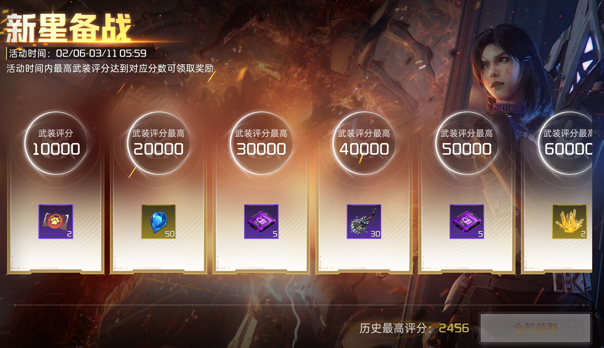 4、新星备战:活动期间达到对应武装评分,即可领取高级宠物选召券、高级芯片升品秘钥、高级战甲碎片(绑)等奖励!